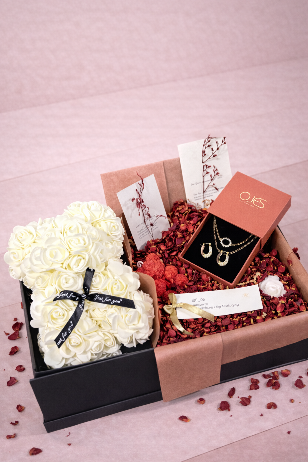 Το μαύρο μακρόστενο κουτί πολυτελούς συσκευασίας, δεμένο με λευκή κορδέλα, αποκαλύπτει ένα ολοκληρωμένο luxury σκηνικό γεμάτο αρώματα, ροδοπέταλα και κοσμήματα με έντονο χαρακτήρα.