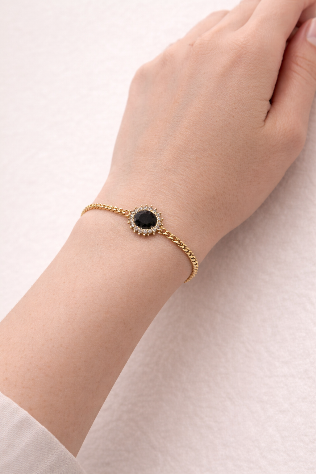 Minimal βραχιόλι με οβάλ μαύρη πέτρα στο κέντρο και διακριτικές διάφανες πέτρες περιμετρικά. Λεπτή αλυσίδα τύπου cable και ρυθμιζόμενο κούμπωμα με προέκταση για άνετη εφαρμογή.