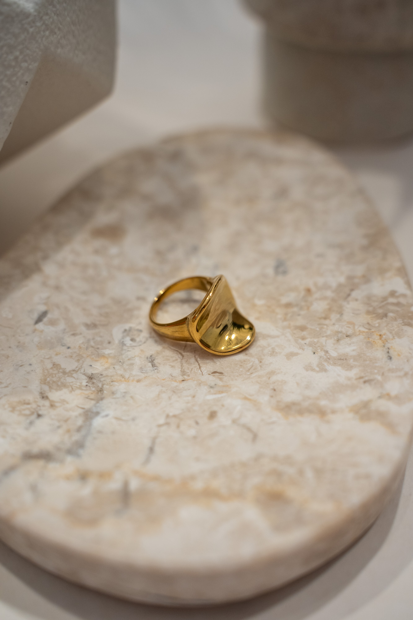 Εντυπωσιακό δαχτυλίδι με οργανική, καμπυλωτή επιφάνεια και γυαλιστερό φινίρισμα. Διατίθεται σε χρυσό και ασημί χρώμα. Κατασκευασμένο από ανοξείδωτο ατσάλι, δεν μαυρίζει και διατηρεί τη λάμψη του στο χρόνο.