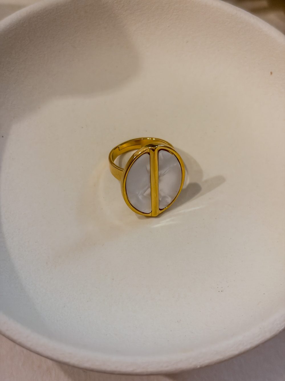 Δαχτυλίδι με οβάλ σχέδιο και λευκό σμάλτο, χωρισμένο στο κέντρο με χρυσή μεταλλική γραμμή. Διατίθεται σε χρυσό χρώμα. Κατασκευασμένο από ανοξείδωτο ατσάλι, δεν μαυρίζει και διατηρεί τη λάμψη του στο χρόνο.
