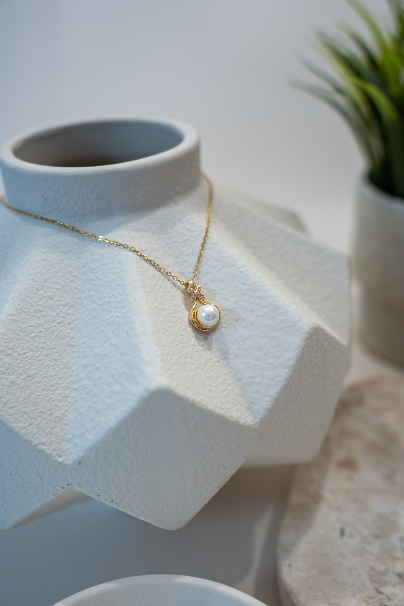 Κλασικό και κομψό, το κολιέ Atherielle διαθέτει εντυπωσιακό κρεμαστό με πέρλα και ζιργκόν σε σχήμα φιόγκου.