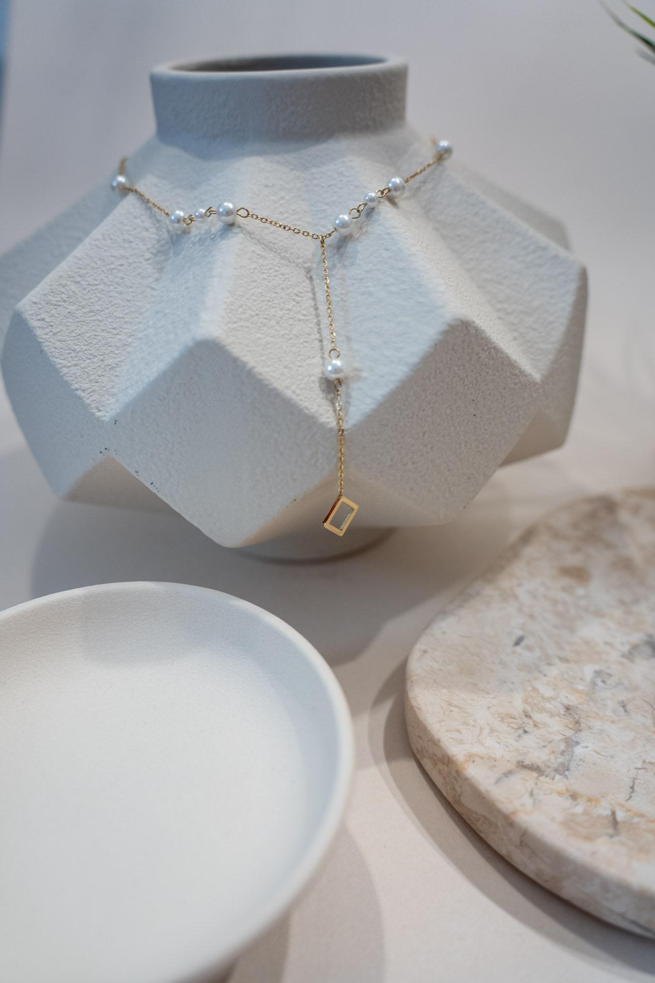Κολιέ με διακριτικές πέρλες και minimal αλυσίδα τύπου lariat για κομψή εμφάνιση. Κατασκευασμένο από ανοξείδωτο ατσάλι, δεν μαυρίζει και διατηρεί τη λάμψη του στο χρόνο.