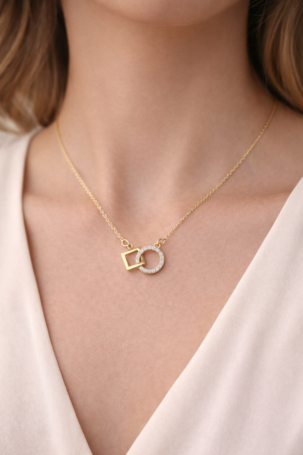 Κομψό κολιέ αλυσίδα με συνδυασμό κύκλου και τετραγώνου στο κέντρο, διακοσμημένο με λαμπερές πέτρες για διακριτική λάμψη. Minimal και μοντέρνο, ιδανικό για καθημερινή χρήση ή layering. Διατίθεται σε χρυσό χρώμα. Κατασκευασμένο από ανοξείδωτο ατσάλι, δεν μαυρίζει και διατηρεί τη λάμψη του στο χρόνο.