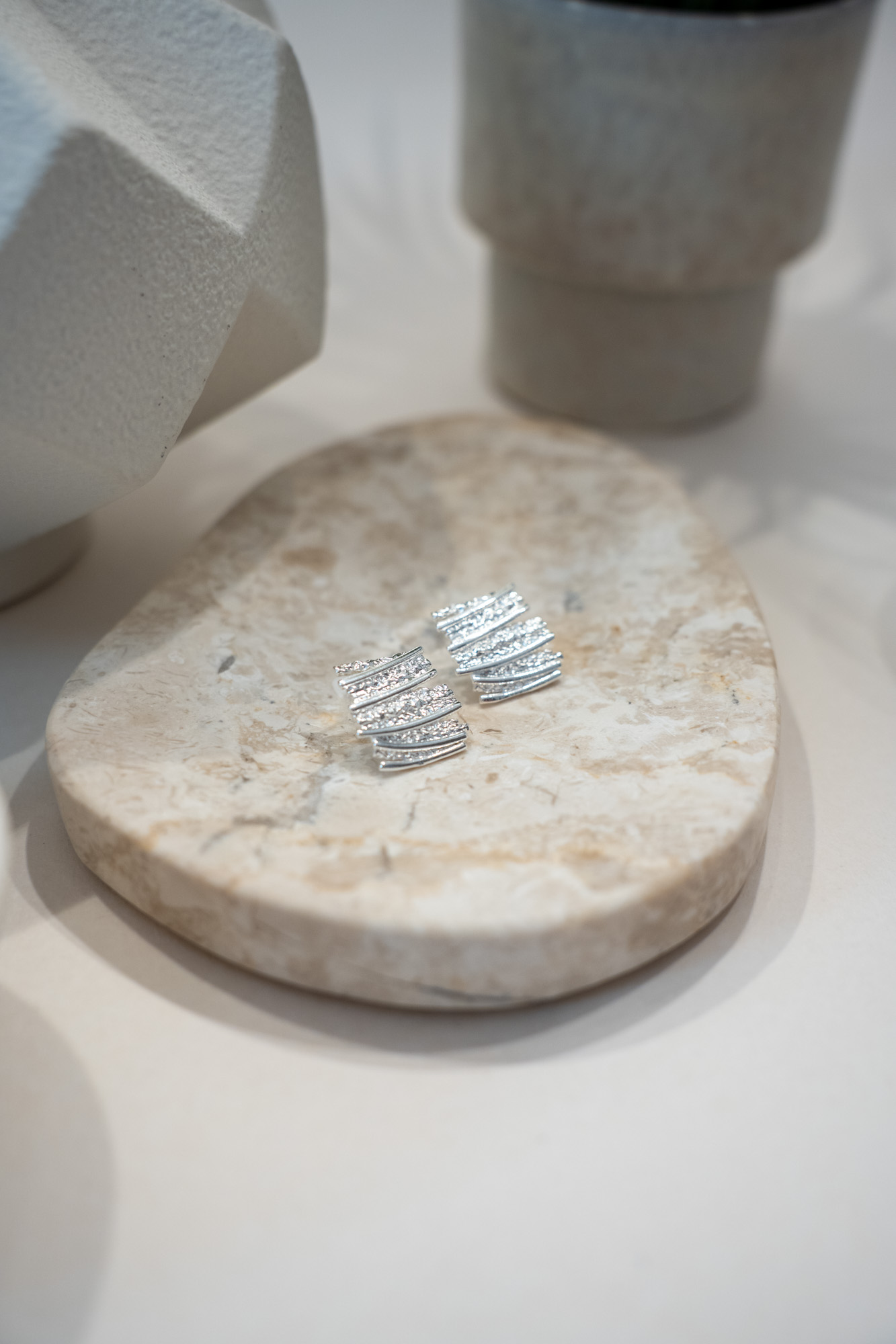 Καρφωτά σκουλαρίκια από ανοξείδωτο ατσάλι με layered υφή και χρυσό ή ασημί φινίρισμα. Γλυπτό design που ξεχωρίζει με δυναμική γεωμετρία και statement χαρακτήρα.