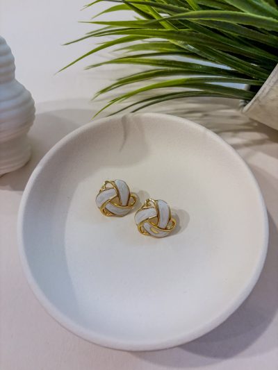 Σκουλαρίκια καρφωτά σε σχήμα κόμπου με λευκό σμάλτο και χρυσό περίγραμμα. Κομψά και διακριτικά, ιδανικά για κάθε στιγμή της ημέρας.