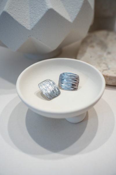 Τα σκουλαρίκια Orionis εντυπωσιάζουν με την απλότητα της φόρμας και τη διακριτική κυματιστή υφή που τους χαρίζει κίνηση και φως. Το ελαφρώς τετράγωνο τους σχήμα συνδυάζει αυστηρή γεωμετρία με μαλακές γραμμές, δημιουργώντας ένα κομψό αποτέλεσμα που αναδεικνύει κάθε εμφάνιση.