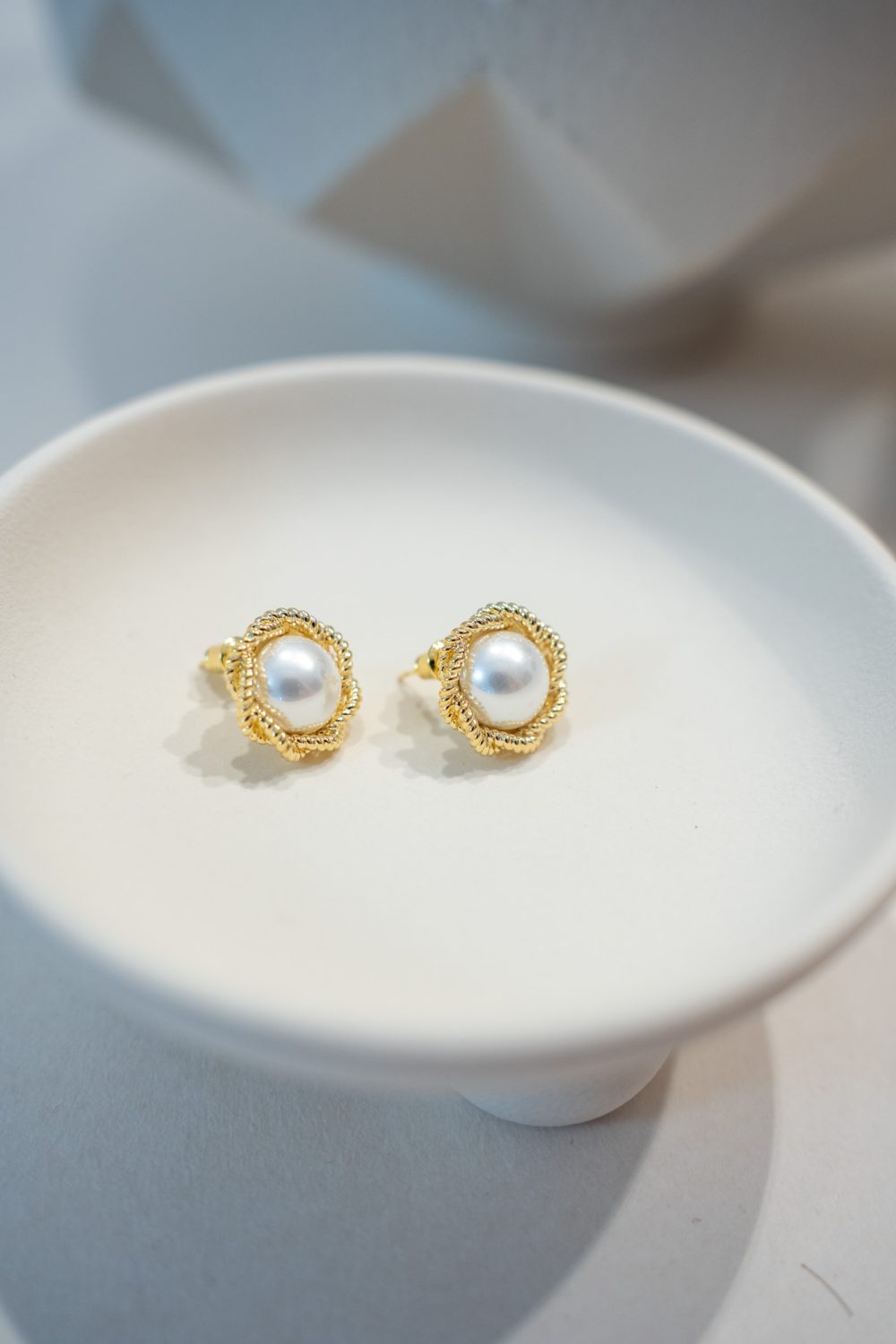 Statement καρφωτά σκουλαρίκια με μεγάλη λευκή πέρλα και πλεκτή ασημί ή χρυσή περίμετρο. Glam, elegant και vintage, ιδανικά για ιδιαίτερες εμφανίσεις με στυλ.