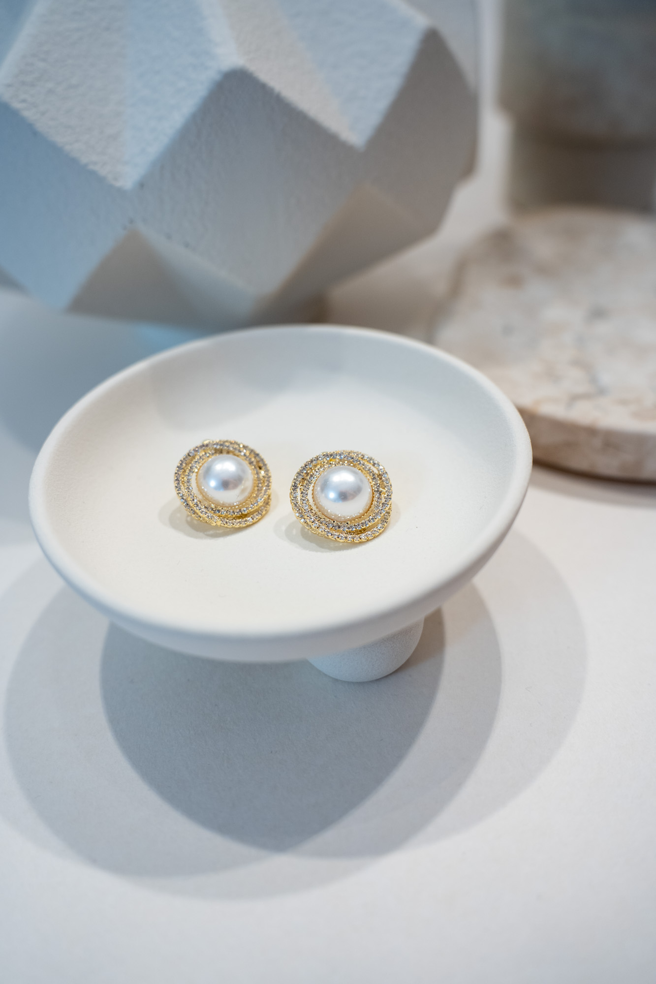 Statement καρφωτά σκουλαρίκια με μεγάλη πέρλα και ασημί ή χρυσή πλεκτή περίμετρο διακοσμημένη με πέτρες. Glam, φωτεινά και ιδανικά για βραδινές και γιορτινές εμφανίσεις.