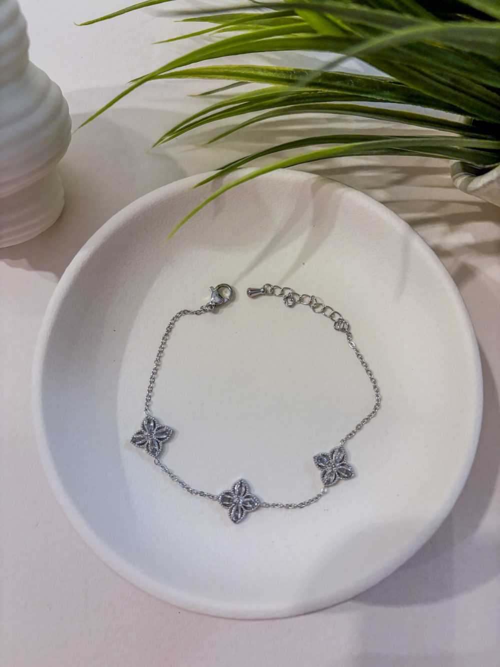 Το βραχιόλι Serene συνδυάζει διακριτική φινέτσα με εντυπωσιακές λεπτομέρειες. Η αλυσίδα του στολίζεται με τρία λουλούδια, διακοσμημένα εσωτερικά με πέτρες που αντανακλούν το φως και προσθέτουν λάμψη σε κάθε κίνηση. Ο minimal αλλά κομψός σχεδιασμός το καθιστά ιδανικό τόσο για καθημερινές εμφανίσεις όσο και για πιο ξεχωριστές περιστάσεις. Η λεπτή αλυσίδα ολοκληρώνει το elegant ύφος του, προσφέροντας ένα βραχιόλι που ταιριάζει σε κάθε στυλ.