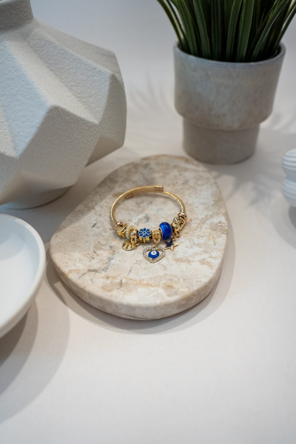 Το βραχιόλι Charm Elarithos συνδυάζει μοντέρνα αισθητική με προστατευτικά σύμβολα, όπως το μπλε ματάκι σε σχήμα καρδιάς. Το design του περιλαμβάνει πληθώρα χρυσών charms όπως αστεράκι, νότα, λουλούδι και πέρλες, δημιουργώντας ένα δυναμικό και ταυτόχρονα κομψό αποτέλεσμα. Ιδανικό για καθημερινές εμφανίσεις ή ως ξεχωριστό δώρο.